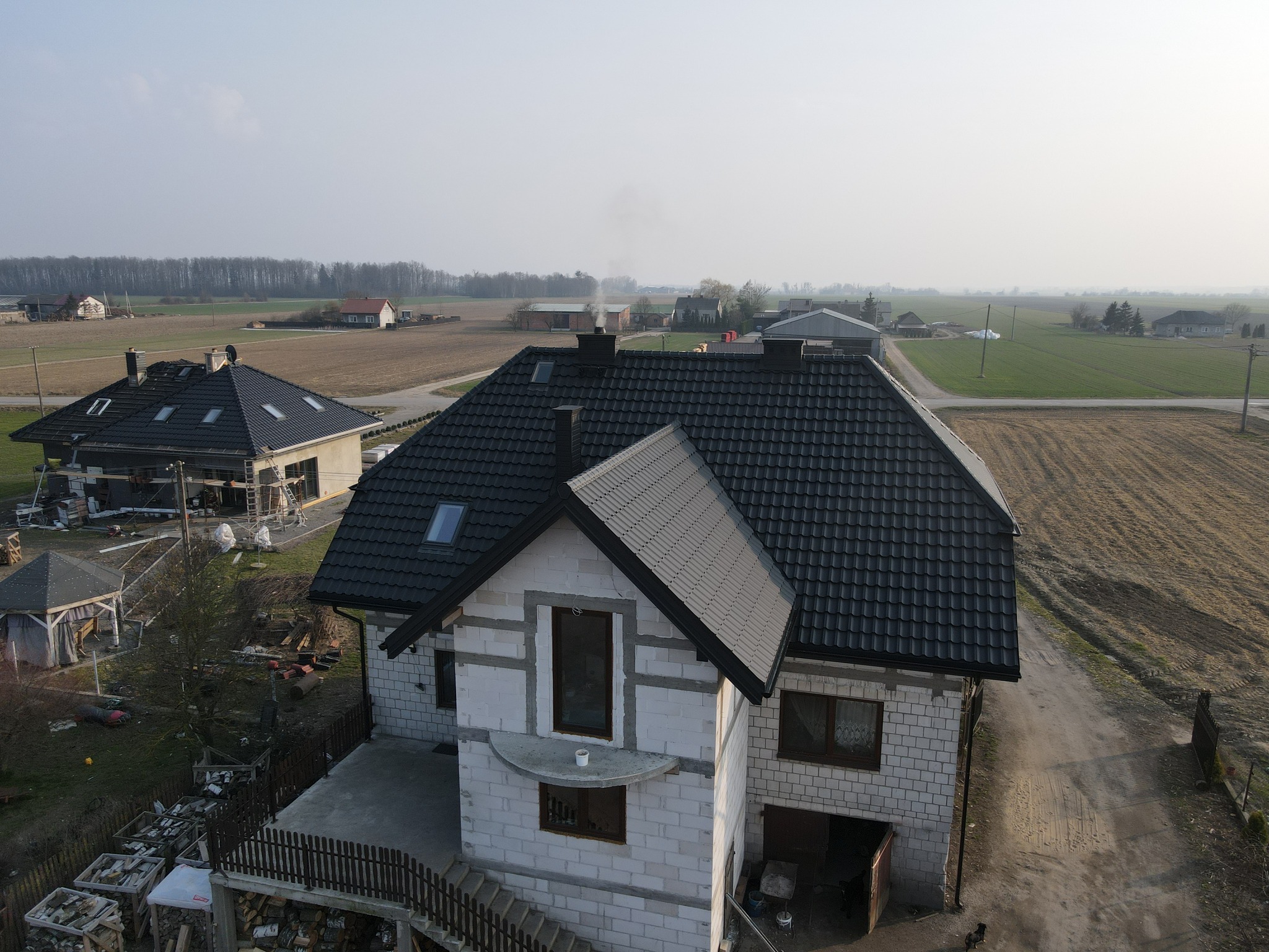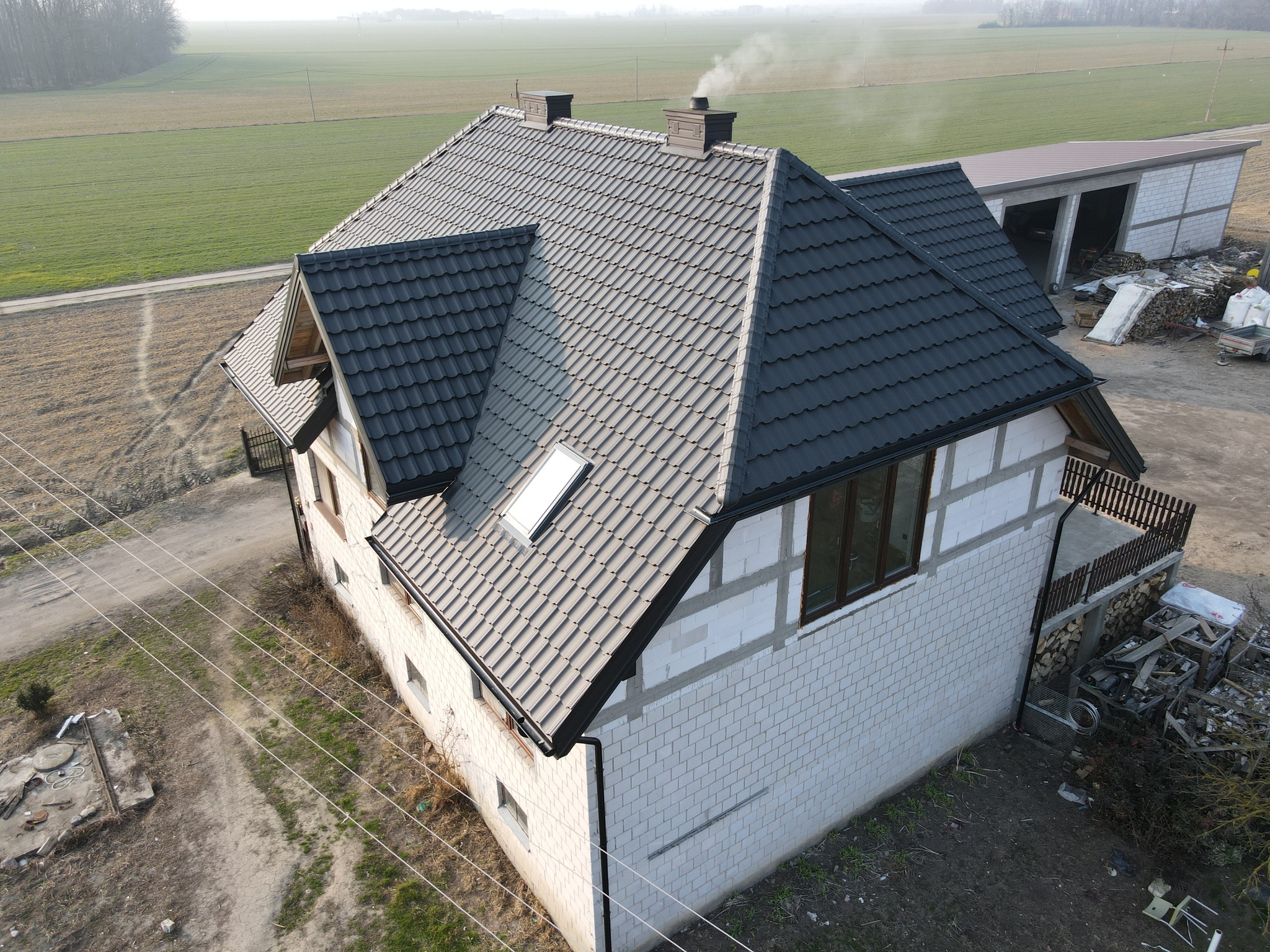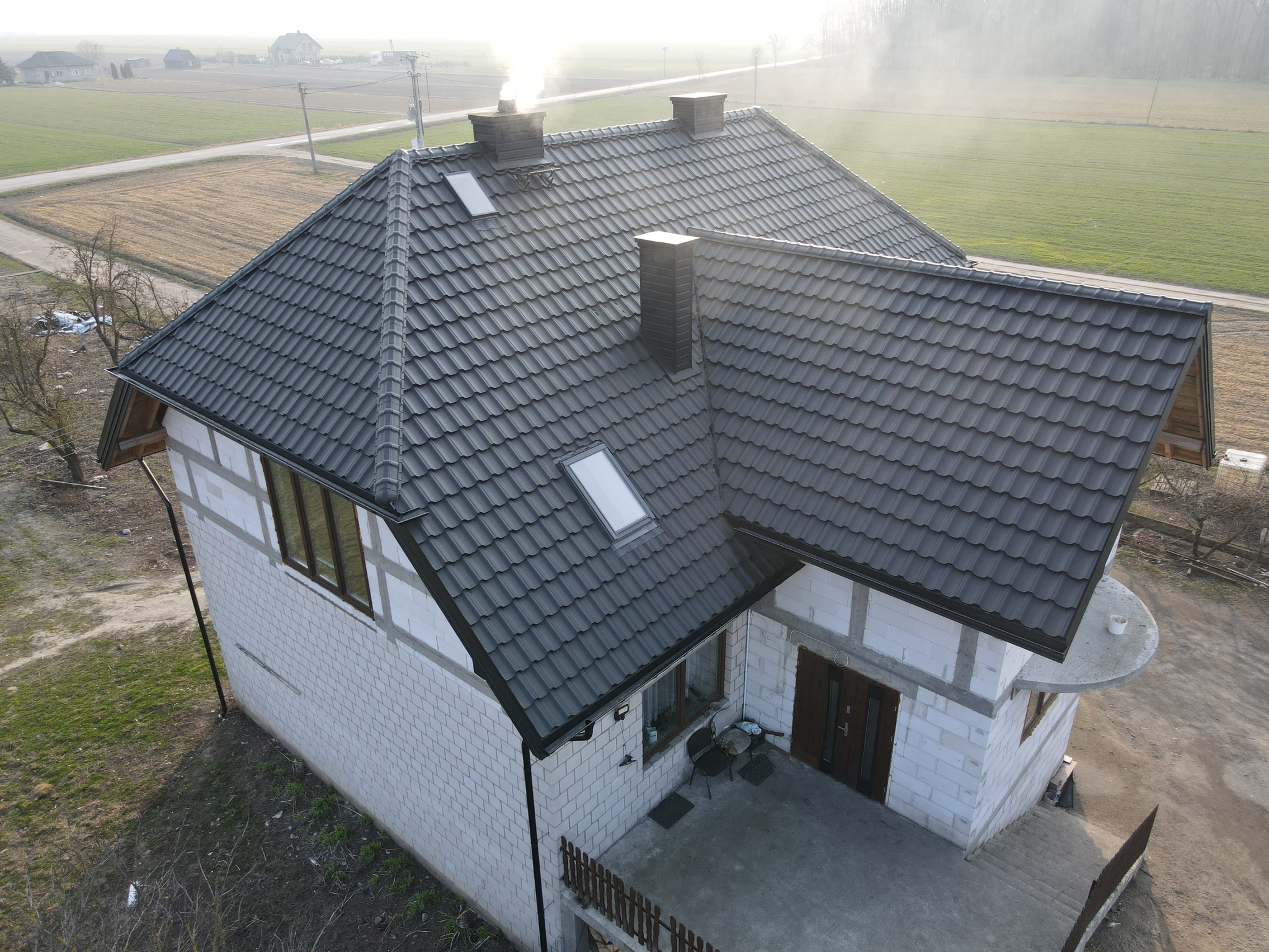Dziś prezentujemy realizację, która doskonale łączy tradycyjny styl z nowoczesnymi technologiami – dach wykonany z blachodachówki modułowej Budmat Venecja, uzupełniony o dedykowane gąsiory GS-LUX, metalowe orynnowanie Flamingo oraz okna dachowe i wyłaz firmy Dakea.