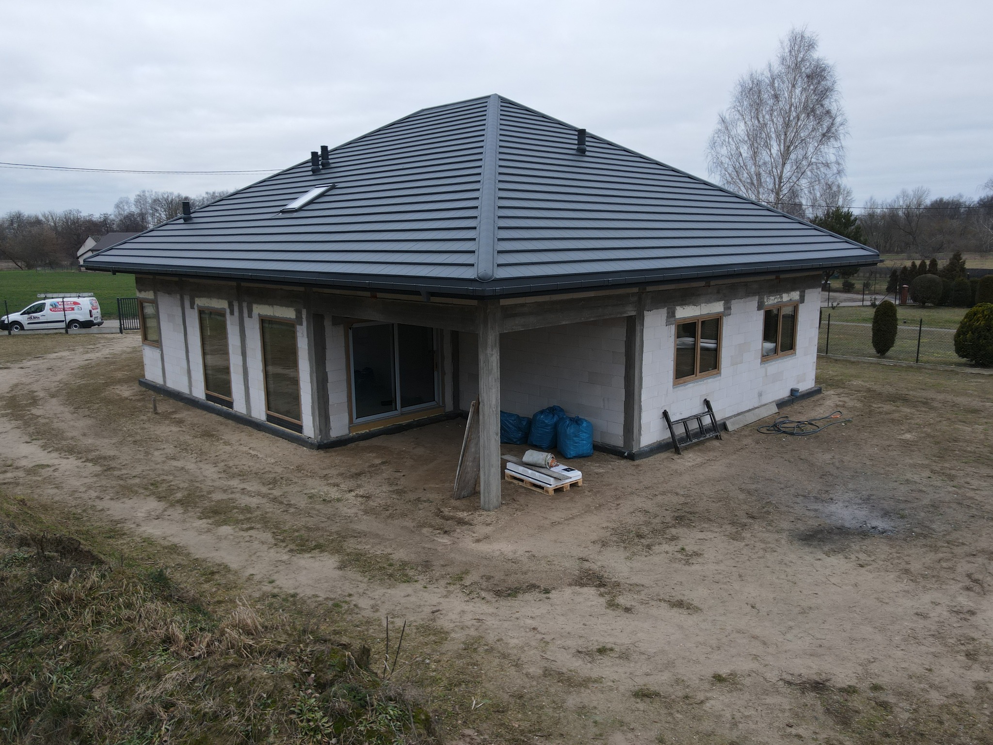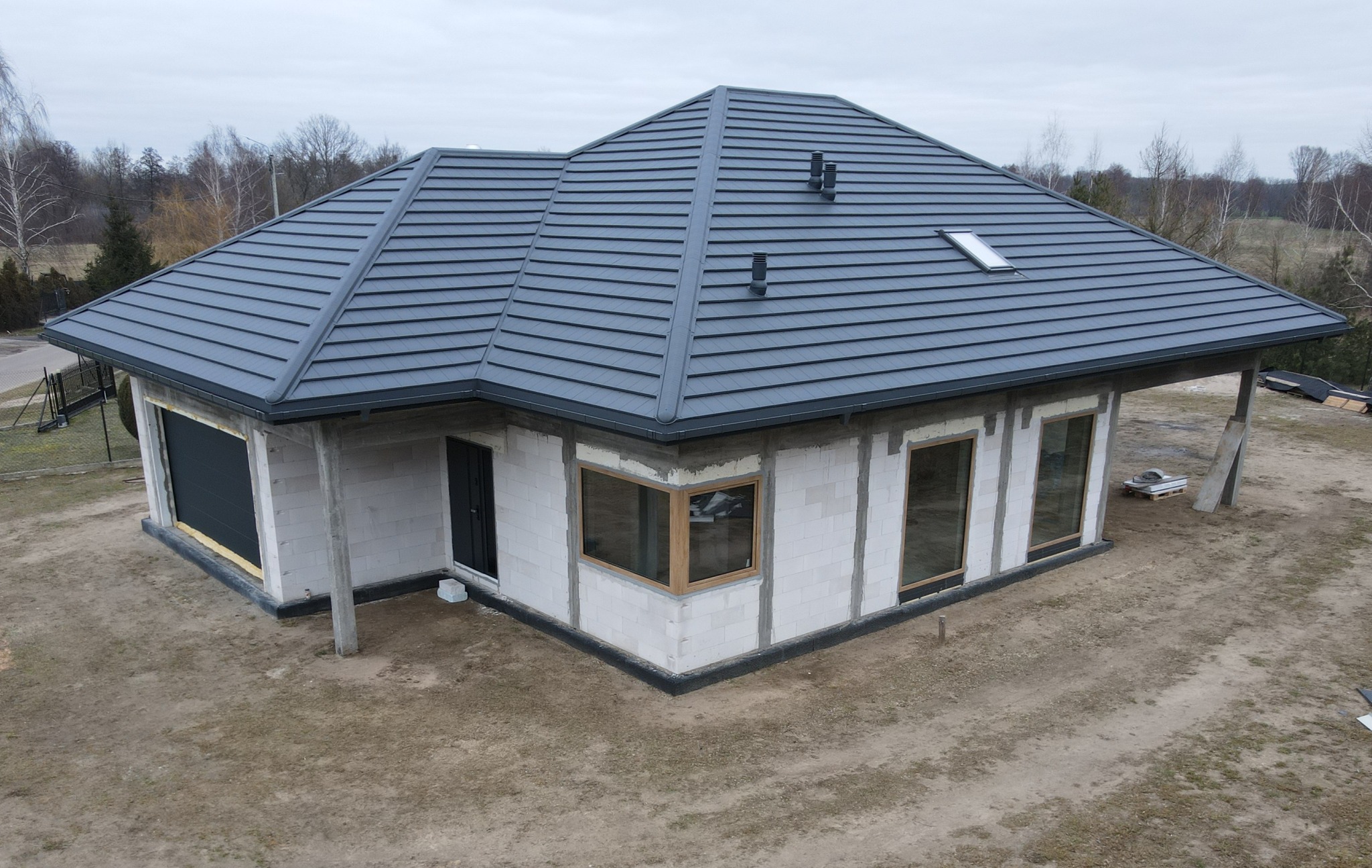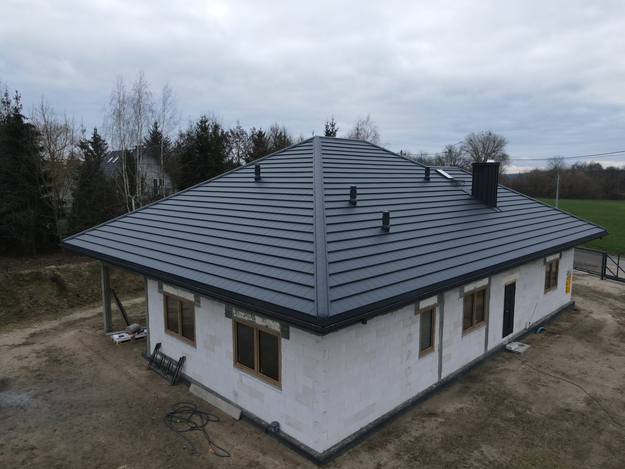 Struktura materiału jest subtelna, dzięki czemu dach prezentuje się bardzo elegancko. Matowe wykończenie w kolorze antracytowym (RAL 7016) nadaje całości wyjątkowego charakteru. Kolor ten jest uniwersalny i pasuje do wielu nowoczesnych elewacji. Pokrycie dachu w tym odcieniu sprawia, że budynek zyskuje prestiżowy wygląd.